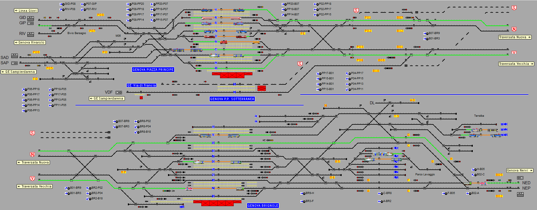 Questa simulazione riguarda lo sviluppo della rete ferroviaria tra le due stazioni principali di Genova Brignole e Genova Piazza Principe lungo la linea Tirrenica secondo l'orario della primavera/autunno 2025. Le linee sono tutte a doppio binario con segnalamento banalizzato e blocco elettrico e quindi per poter sfruttare appieno questa funzionalità e non incorrere in penalità dovute alla mancata apertura degli itinerari occorre utilizzare la versione 3.9.12 del programma con l'ultima versione del pacchetto Segnali 6.0.