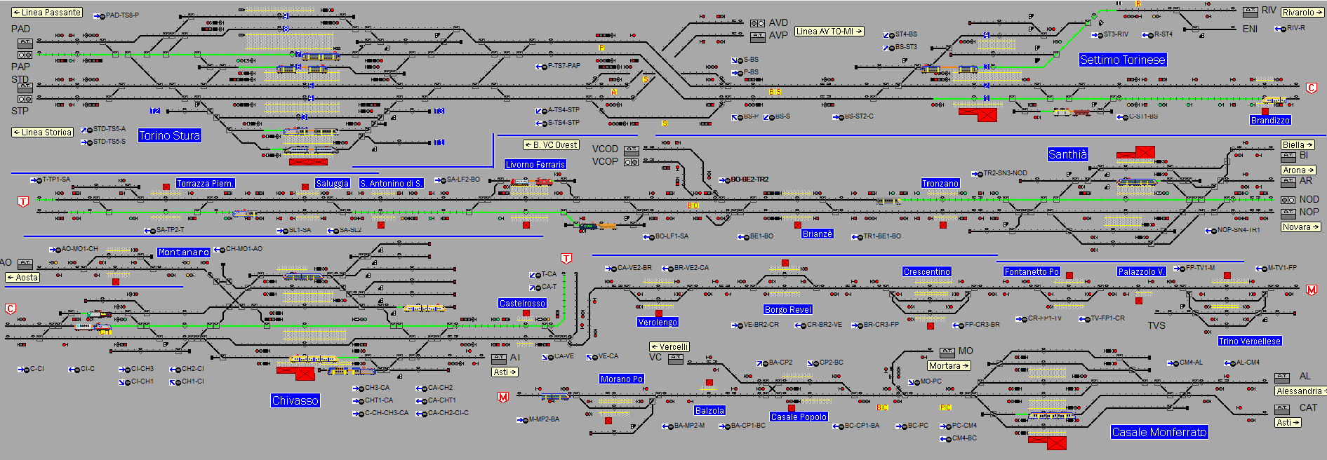 Questa simulazione riguarda il fitto reticolo di ferrovie (principali e secondarie) che gravitano nella zona nord-est di Torino sulla linea Torino-Milano.